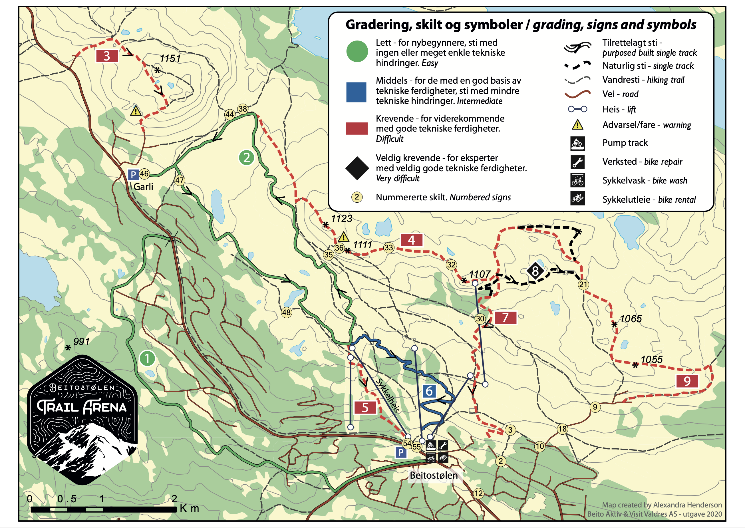 Morsom bygd løype nedover i heisområdet. Massevis av doseringer, kuler og hopp! Bare å gi gass og ta heisen opp igjen. Lurt å ta en rolig oppvarmingsrunde først. A fun built downhill trail in the alpine slope. Lots of rollers, bridges and berms. Just let loose and use the lift to get back up. Cycle a calm warm up round first to get to know the trail.
